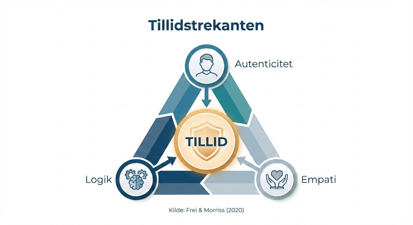 Tillidstrekanten påstår, at tillid hviler på tre ligeværdige fundamenter: Autenticitet, Logik og Empati. Modellen kan siges at fungerer som et diagnostisk redskab. Altså, hvis tilliden til en person svigter, skyldes det næsten altid en svækkelse – en såkaldt "vaklen" (wobble) – i én af disse tre dimensioner. Ved at identificere, hvilken side af trekanten der er svagest, kan den professionelle målrette sin adfærd for at genopbygge troværdigheden (Frei & Morriss, 2020).